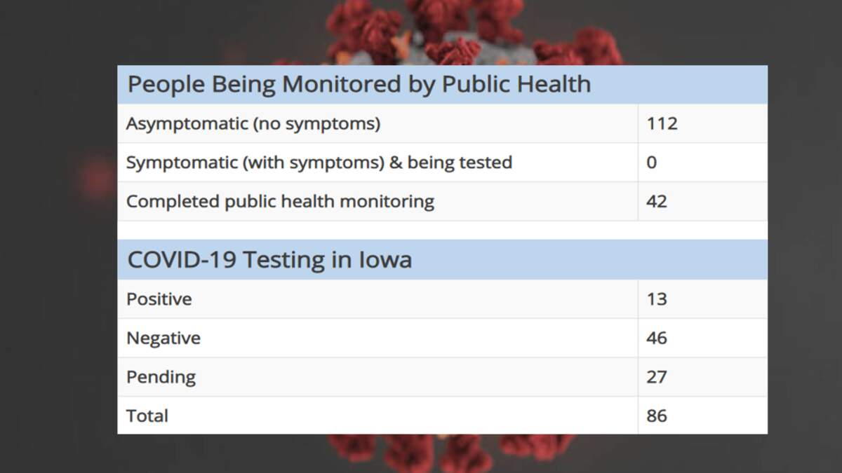DES MOINES, Iowa - There are now 13 cases of Coronavirus in Iowa, and 27 more tests pending, including 18 Iowans from that cruise ship that came ashore in California.
